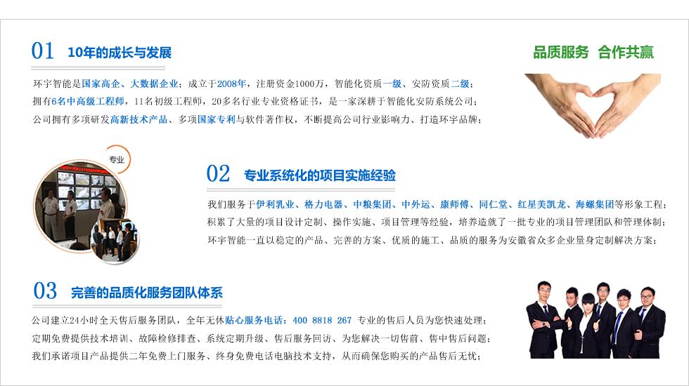 合肥市環宇智能工程有限公司成立于2008年科創版上市企業,現注冊資金1000整,電子與智能化系統集成資質壹級,安防資質,是“國家高新技術企業”、“合肥市高新技術產品認定企業”、“安徽省安防協會會員單位”、“AAA級信用等級認證企業”、“AAA級重合同守信用企業”、“合肥市創新型企業”、是行業領先的智能化整體解決方案的集成商